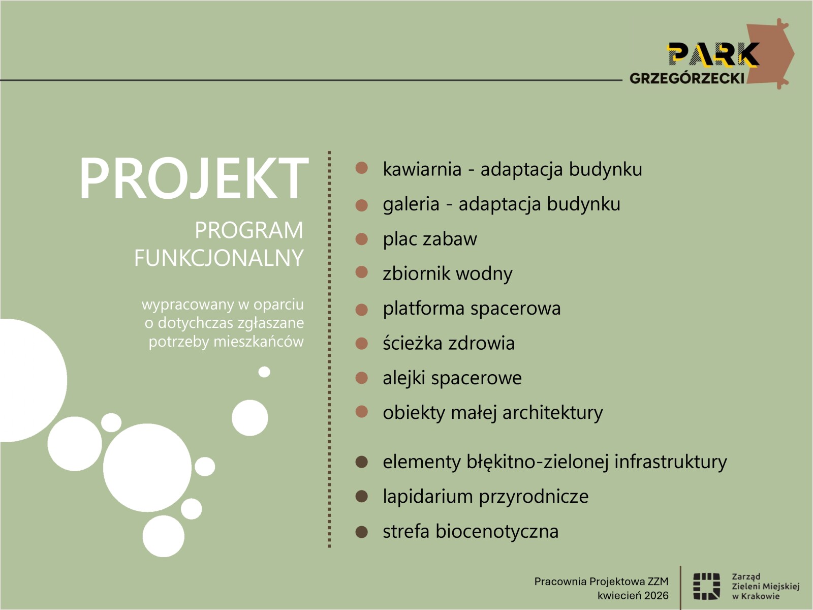 Konsultacje odbędą się w terminie 14 kwietnia – 8 maja 2026 r. i będą okazją do wspólnej rozmowy o tym, jak Park Grzegórzecki powinien wyglądać i funkcjonować w przyszłości. Chcemy poznać opinie mieszkańców, użytkowników parku, przyrodników, rodziców z dziećmi, seniorów oraz wszystkich osób, które na co dzień korzystają z Parku Grzegórzeckiego.