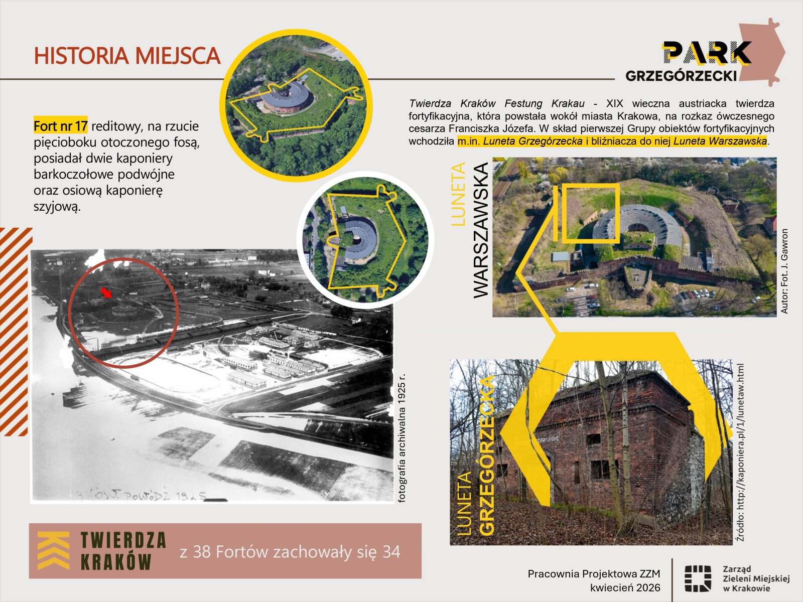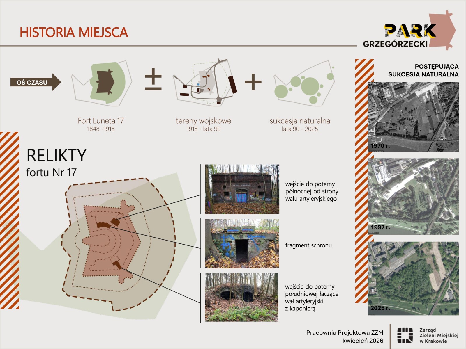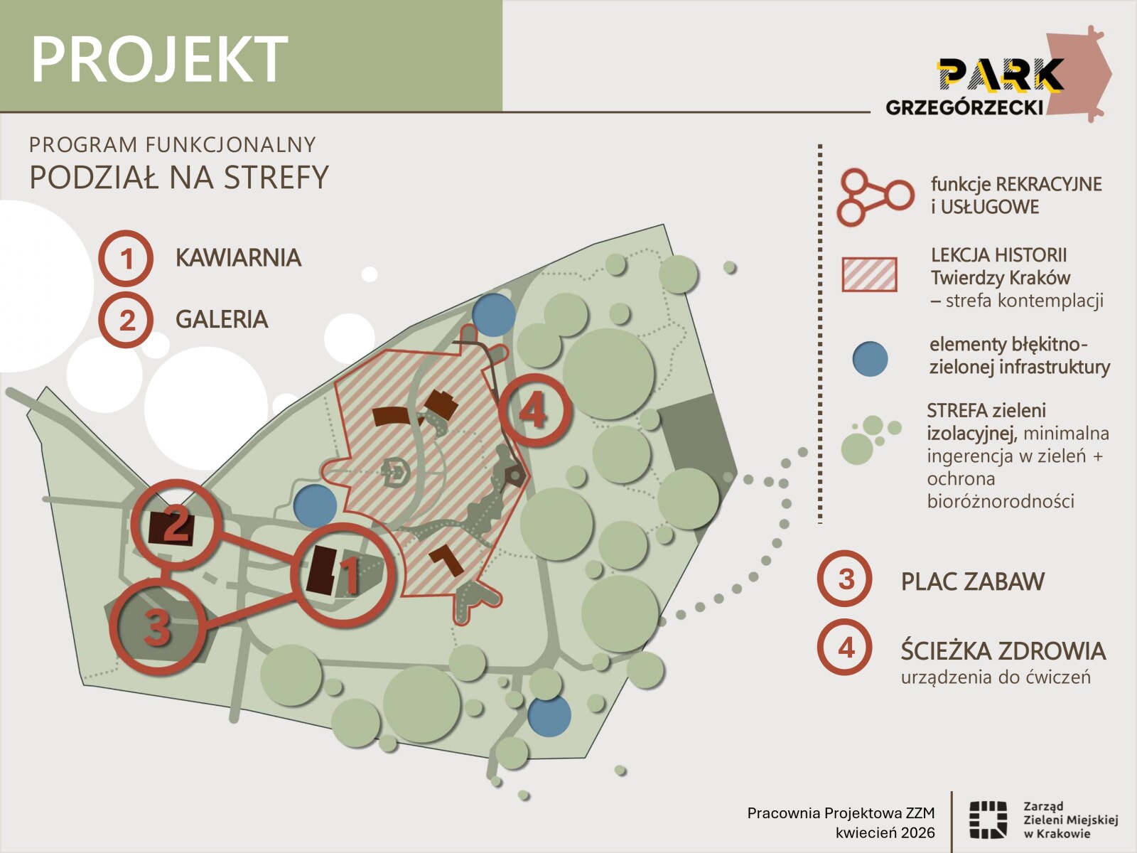 Park Grzegórzecki jest przestrzenią wyjątkową – cenną nie tylko pod względem przyrodniczym, ale również historycznym. Na jego terenie znajdują się relikty fortów, które stanowią ważny element dziedzictwa miejsca i wymagają odpowiedniego podkreślenia oraz wyeksponowania. Obecnie park jest jedynie częściowo dopuszczony do użytkowania. Opracowana koncepcja zagospodarowania terenu stanowi podstawę do realizacji przestrzeni bezpiecznej, dostępnej, przeznaczonej dla osób w różnym wieku, o zróżnicowanych potrzebach, przy jednoczesnym poszanowaniu istniejącej zieleni oraz zachowanych elementów historycznych.