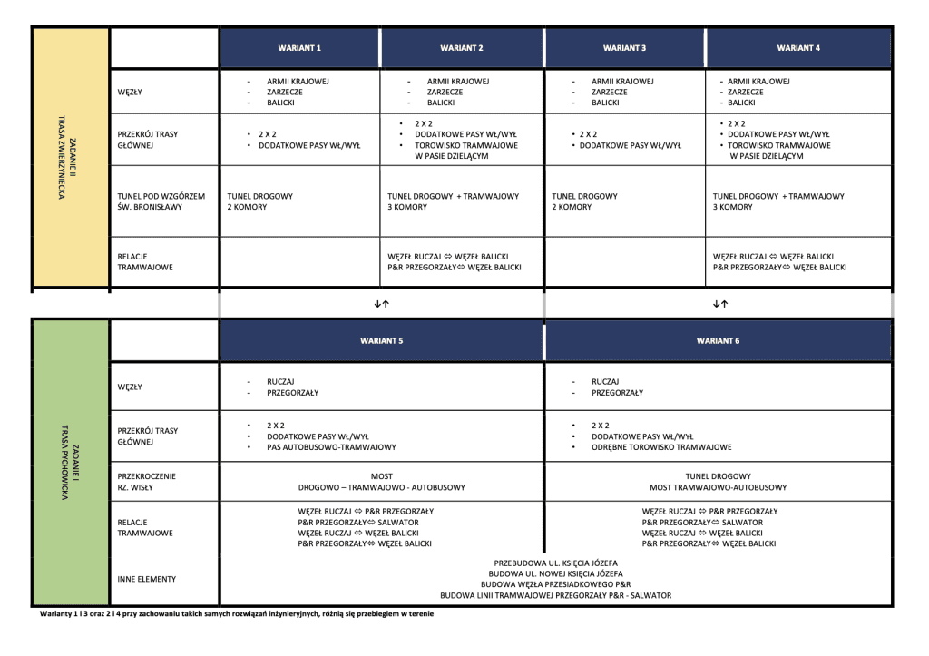 Trasa Zwierzyniecka: w ramach tej Trasy opracowano 4 warianty. Dla dwóch z nich (2 i 4) przewidziano linie tramwajową na całej długości trasy – a więc od hubu komunikacyjnego na Ks. Józefa do ul. Balickiej. Poszczególne warianty różnią się też przebiegiem w terenie.
