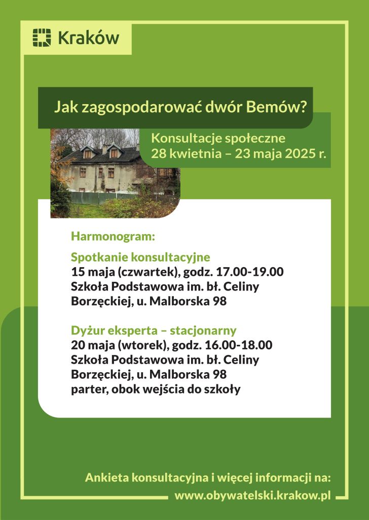 W okresie od 28 kwietnia do 23 maja 2025 r. Zarząd Zieleni Miejskiej w Krakowie oraz Wydział Dialogu, Konsultacji i Kontaktu Obywatelskiego Urzędu Miasta Krakowa prowadził z mieszkankami i mieszkańcami Krakowa konsultacje społeczne pn.: „Jak zagospodarować Dwór Bemów?".